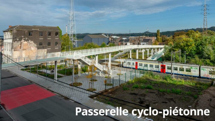 L’installation de la passerelle cyclo-piétonne reliant la nouvelle halle centrale dédiée à la création d’événements multiples (brocantes, concerts, expositions) au parc de Trasenster, avec un accès aux quais de la gare d’Ougrée.