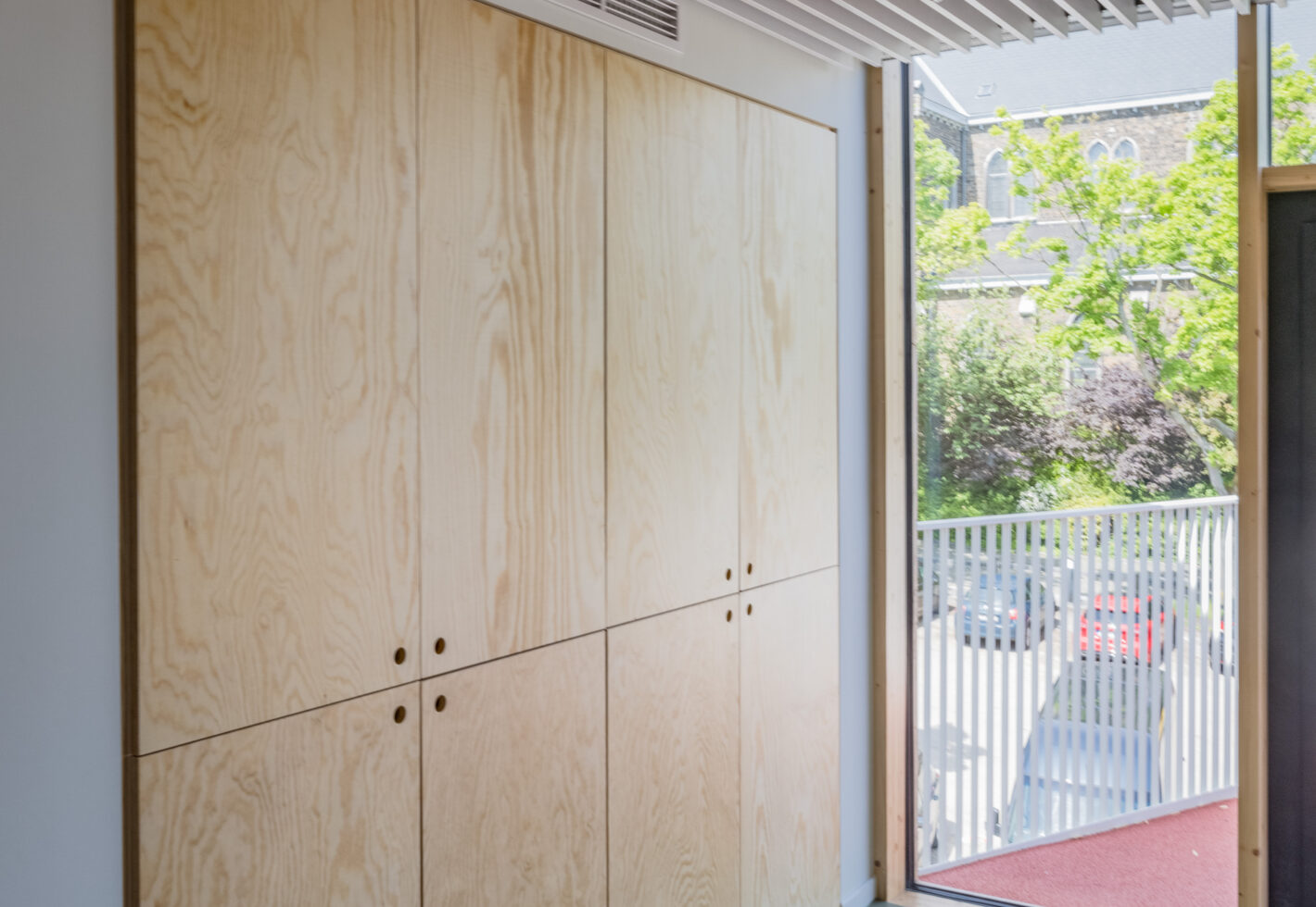 Le bâtiment en L présente un rez-de-chaussée et deux étages. Le rez est principalement occupé par l’accueil, les vestiaires et les bureaux de la Direction. Chaque étage correspond à une catégorie d’âge et comporte les locaux qui conviennent à leur accueil. La conception du mobilier tient compte de critères esthétiques et ergonomiques, tant dans l’habillage des portes en mélaminé stratifié que dans la composition des placards ou encore pour les poignées et charnières invisibles avec un système d’ouverture et de fermeture silencieuse.